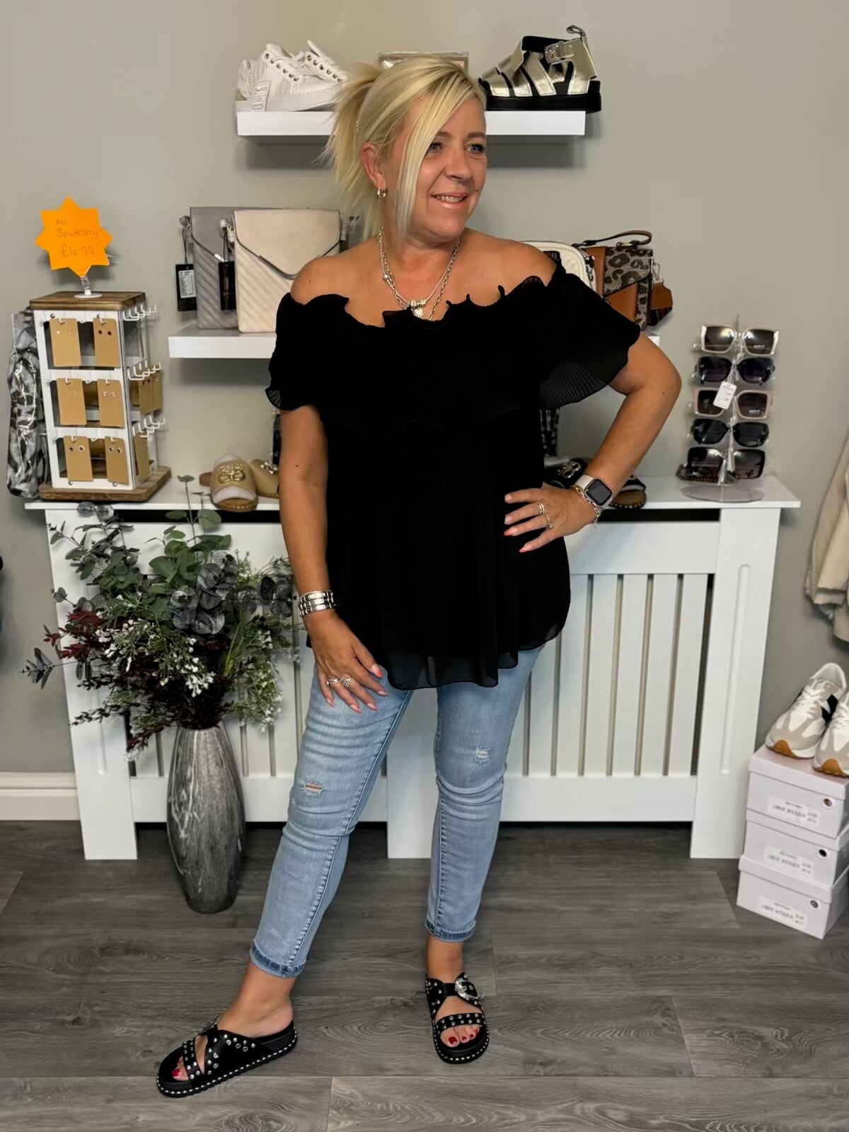 Plain Crinkle Bardo Top - Black ONE SIZE: 10-20